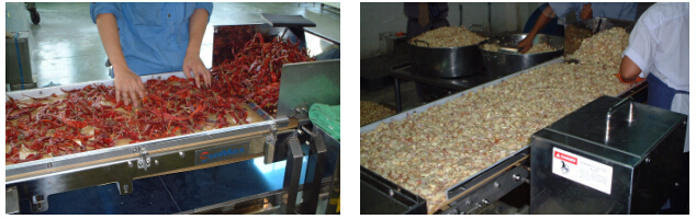 投入洋葱、辣椒、大蒜等蔬菜等,数秒钟后,浮出油面、排出油,通过传送带送出去