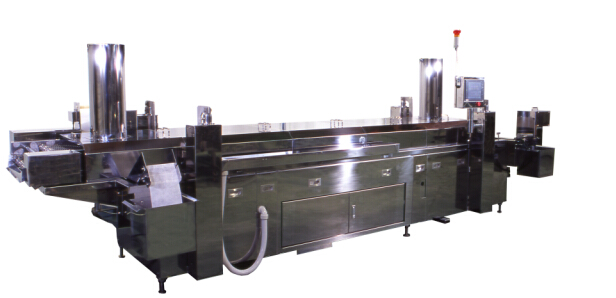 原料通过特氟隆网带传送带将定量的原料投入到油炸机