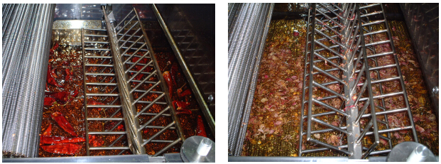 运送的产品在油炸机中用中央的回转搅拌,防止油炸不均匀的情况发生。