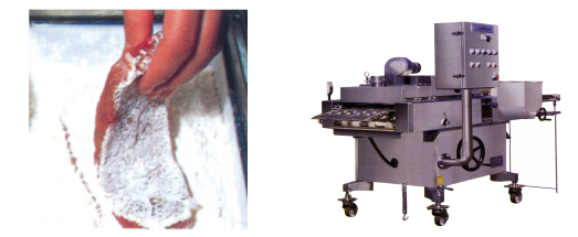 除去里脊肉的薄皮及筋;把肉切成¢4cm×2cm厚(30g)的肉块,把把肉与脂肪之间的筋切除。