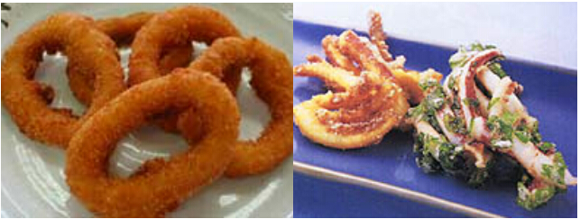 .过面包糠的鱿鱼在油中炸,加工出外脆内软的鱿鱼。